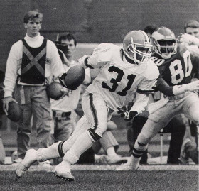 Hi, my name is Frank Minnifield. I was born January 1, 1960, in Lexington, Kentucky. I played defensive back for the Cleveland Browns from 1984-93. I attended Henry Clay High School in Lexington, but was considered too small for college football at just 5'9" and 140 pounds. I walked on to the football team at the University of Louisville, and as a junior in 1981, I led the nation in average yards per kickoff return (30.4). After graduation in 1982, I joined the Chicago Blitz (later the Arizona Wranglers) of the USFL, but I had to successfully sue the Wranglers for the right to move to the NFL, where I signed as a free agent with the Browns in 1984. I quickly became a fixture at cornerback for the Cleveland Browns and was named to the Pro Bowl four straight years from 1986-89. I was named to the NFL 1980s All-Decade Team as selected by voters of the Pro Football Hall of Fame, but perhaps more importantly to Cleveland fans, my fellow cornerback Hanford Dixon and I originated and named the Dawg Pound cheering section at Cleveland Stadium.