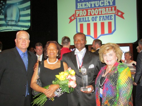 Franky Minnifield with the Blanton Collier Award accompanied by Blanton Collier Hansen (grandson of Blanton Collier from Houston), wife Diane Minnifield and Kay Collier McLaughlin (daughter of Blanton Collier from Lexington)